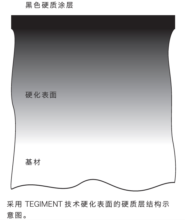 这也是大家常常见到为什么明明是硬化涂层依然会脱落的原因; 而TEGIMENT 硬化钢材由于是从内到外逐渐过度硬化的过程,再与高强度PVD的结合,使得涂层能很好地附在钢材上,再也无需担心有色涂层会从表壳上脱落。
