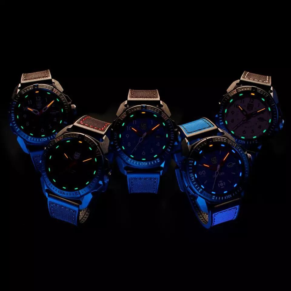 Luminox独家的LLT(Luminox Light Technology)照明技术和橙绿两色氚气灯管,确保在极夜情况下也明亮易读。